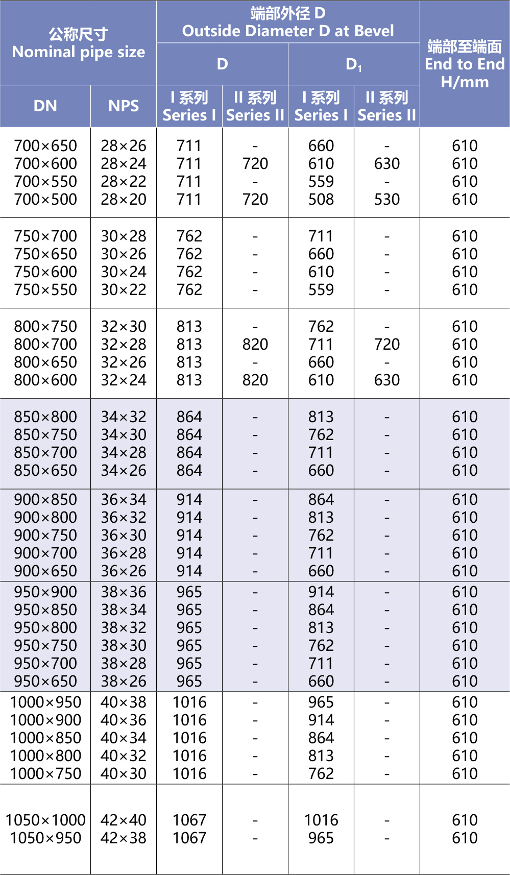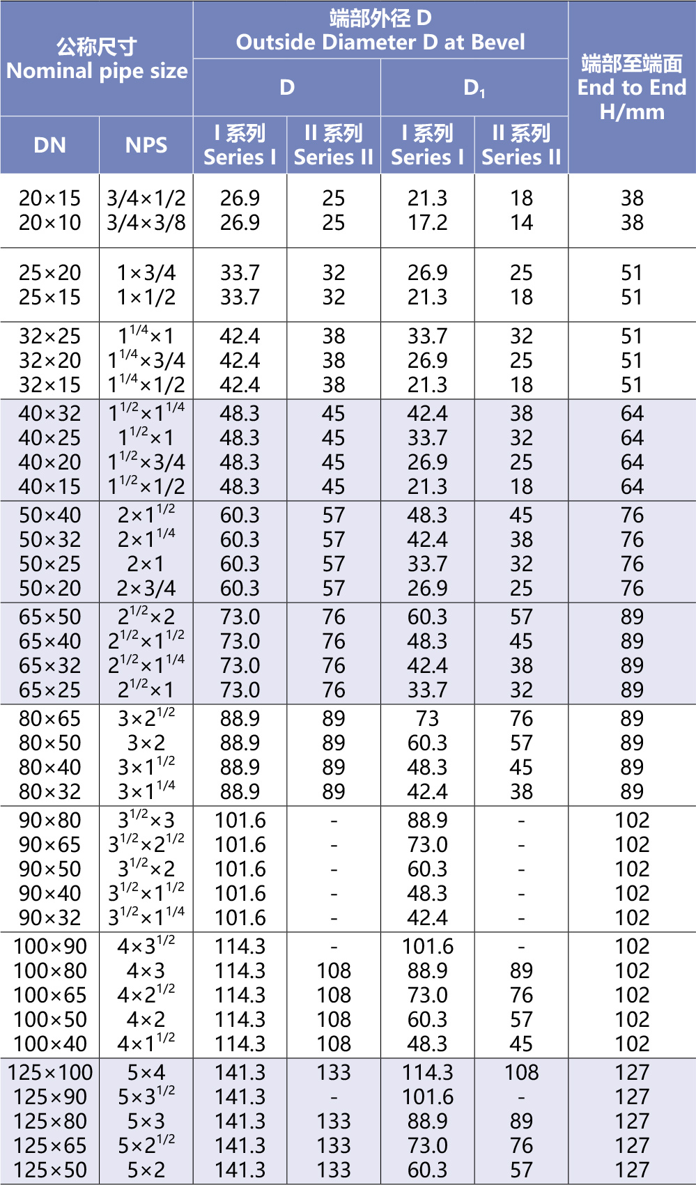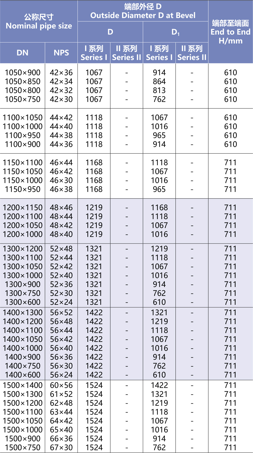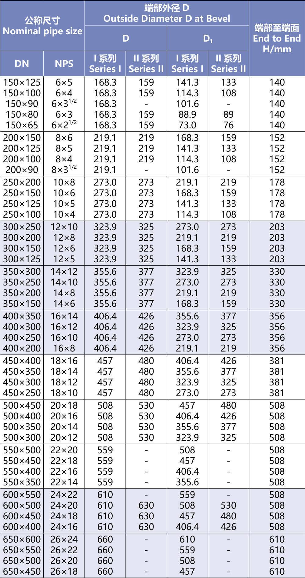異徑管的質(zhì)量應(yīng)符合現(xiàn)行國家標(biāo)準(zhǔn)《鋼制對(duì)焊無縫管件》GB/T12459-2005及《鋼板制對(duì)焊管件》GB/T13401-2005的規(guī)定,異徑管的圓度不應(yīng)大于相應(yīng)端外徑的1%,且允許偏差為±3mm;異徑管尺寸允許偏差應(yīng)符合表4.2.2-3的規(guī)定。異徑管的材質(zhì)執(zhí)行SY/T5037、GB/T9711、GB/T8163、美標(biāo)ASTMA106/A53GRB,API5L、APT5CT、ASTMA105、ASTMA234、ASTMA106、DIN德國標(biāo)準(zhǔn)及客戶要求標(biāo)準(zhǔn)。